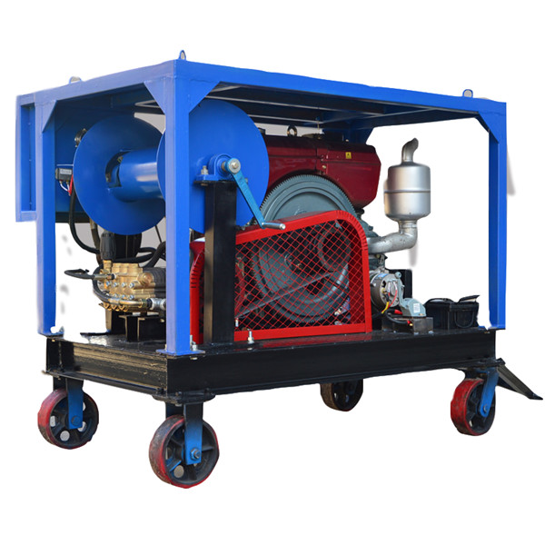 高壓管道疏通機以汽油機、柴油機或電機為動力驅動高壓泵運轉,利用高壓水射流在噴頭上產生的推進力疏通管道。當噴頭到達管端時,膠管在卷管器拉力作用下強制后移動,此時高壓水清掃管壁并將雜物帶至管外,以達到清洗管道的目的。